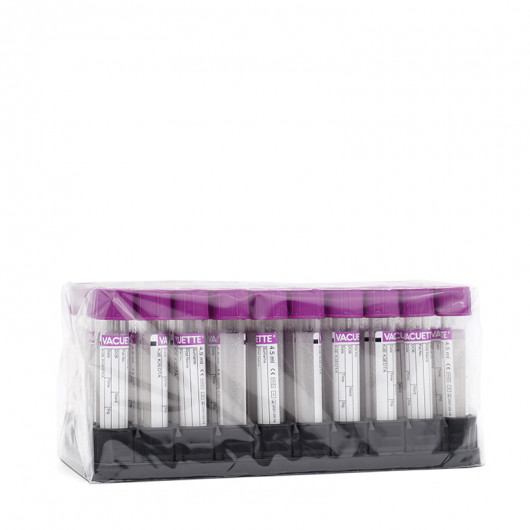 Tubs per a extracció de sang per efecte de buit, amb additiu EDTA aplicat per aspersió, que genera un efecte anticoagulant irreversible, recomanats per a certes proves d'hematologia.