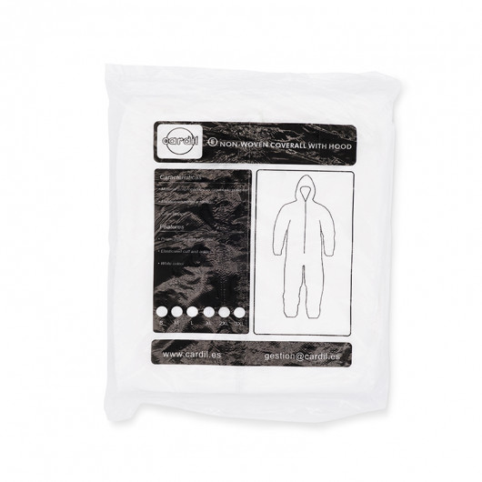 Mono desechable de polipropileno - tejido no tejido (TNT) tipo Spundbond, embolsado individualmente. Tiene capucha con goma incluida, cremallera frontal y gomas de ajuste en las aberturas de manos y pies.