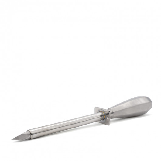 Instrumento punzante utlizado para ayudar a la expulsión de gases en casos de timpanismo gaseoso en el aparato digestivo de rumiantes. Consta de un elemento punzante con una punta de tres aristas recubierto de una cánula, todo de metal.